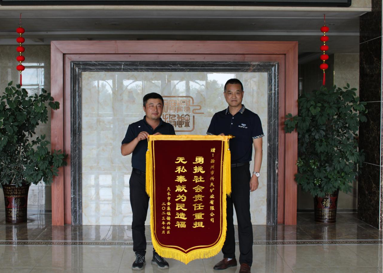 7月17日,天長市金集鎮(zhèn)諭興社區(qū)將一面印有“勇挑社會責(zé)任重?fù)?dān),無私奉獻(xiàn)為民造福”的錦旗送到了興天礦業(yè)。